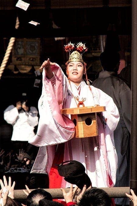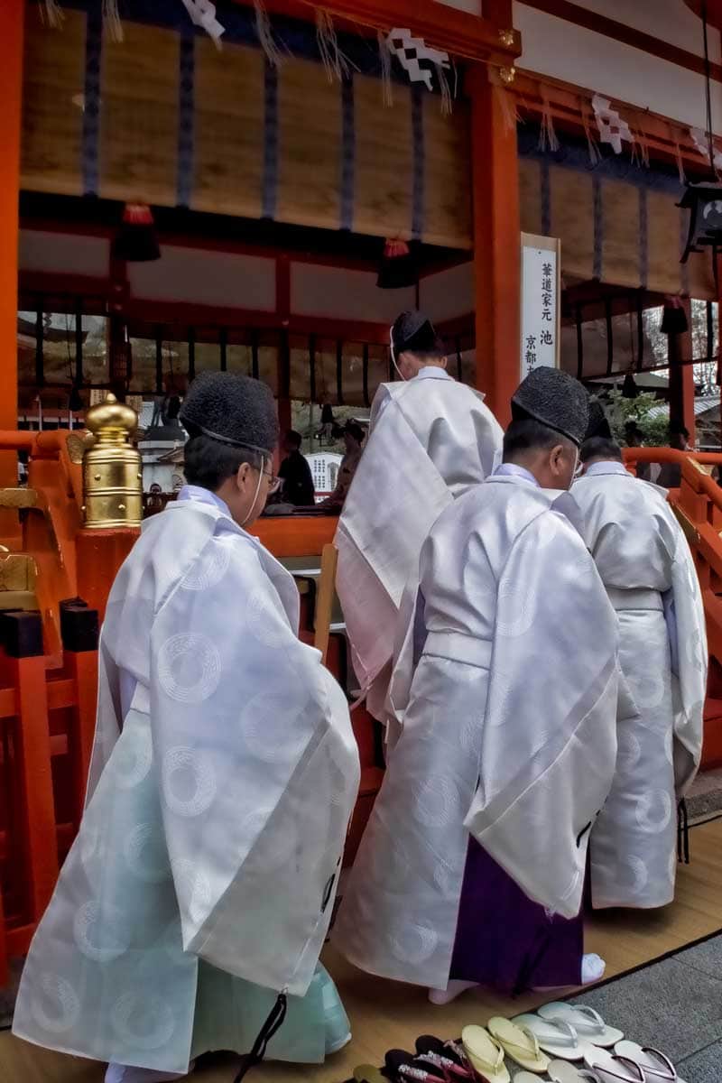 The Kannushi is a Shinto priest. He is identifiable by his unusual headdress, the shaku or wooden batten he carries, his robes and black clogs. He is responsible for the religious observance and running of the shrine.