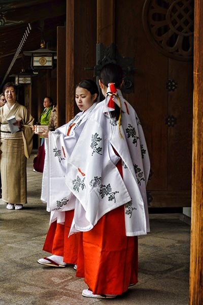 The young women in the shrine are Miko they are assistants or shrine maidens and are involved in both ceremonial and administrative functions.